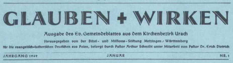 | Beschreibung | Titelgrafik "Glauben + Wirken" vom Januar 1949, Ausgabe des Ev. Gemeindeblattes aus dem Kirchenkreis Urach; herausgegeben von der Bibel- und Missions-Stiftung Mettingen / Württemberg für die evangelisch-lutherischen Deutschen aus Polen, besorgt durch den Pastor Arthur Schmidt unter Mitarbeit von Pastor Dr. Erich Dietrich |